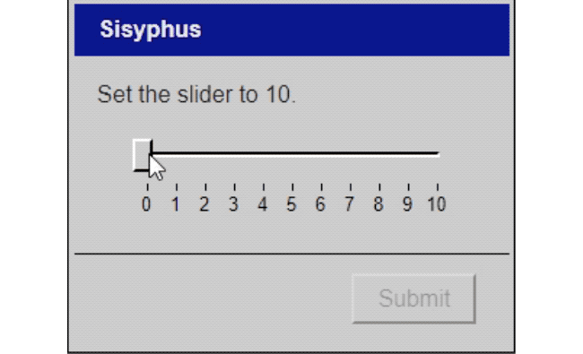 There are five punishments in total, as famously dealt out to Sisyphus, Danaids, Tantalus, Prometheus and Zeno. However, they all have unique twists based on the UI interface – so for instance, instead of rolling a boulder up a hill as Sisyphus, you attempt to set a slider to 10, but the slider resets to zero every time you try to press “Submit”.