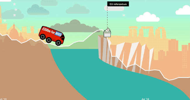 Brexit Bus is a fun little game that sees you attempting to drive the Brexit Bus along a course that faithfully represents the ups and (mostly) downs that the Great British Pound/Euro exchange rate has taken since that infamous Brexit Referendum announcement.