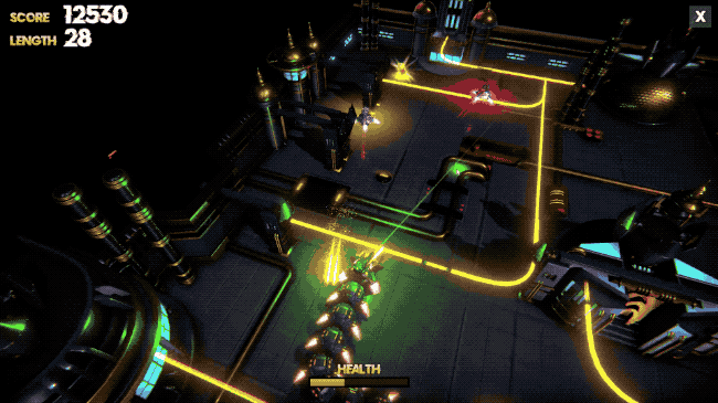 Mechasnek is a super tough fusion of Snake and intense twin stick combat which sees you blasting robotic enemies and grabbing the glowing pellets they drop to grow your mechasnek.