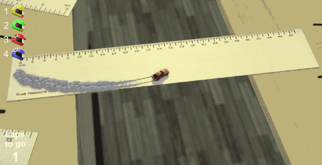 The track design is very creative and full of neat little touches – such as a track lined with dominoes you can topple over and a functioning toy railroad running through it. If you’re playing against the AI racers you’ll find the courses challenging initially as (much like in Micro Machines) you really have to learn them as you can’t see far enough ahead to anticipate most corners. It’s most fun in multiplayer though, particularly the classic head-to-head mode which sees you vying for points by driving far enough ahead of your opponent to knock them off the screen.