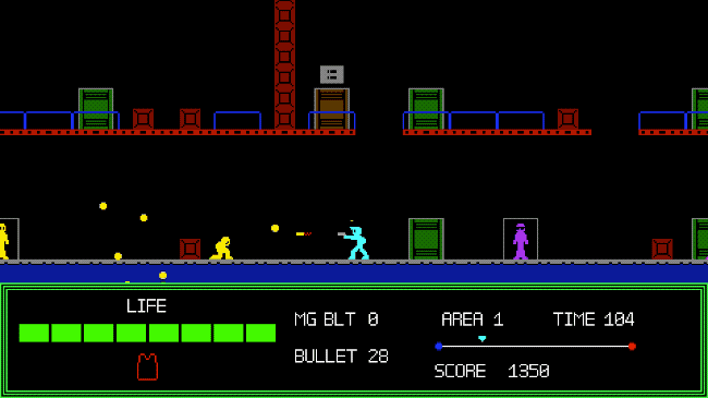 The enemies come in different colors, each of which signifies what type of weapon they use (fists, hand guns, grenades, etc.). The action is very fast paced with you dodging bullets and jumping between the top and bottom level on your race towards the end of each level. There are doors you can enter for a little respite, and some of them (with an emblem above them) will top up your ammo and your body armor – but you’ll still need some serious skill to get to the end!