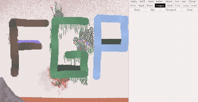 In Sandspiel you are given a blank canvas and a selection of different substances you can add to it – Sand, Water, Stone, Walls, Ice, Gas, Mites, Wood, Plants, Fungus, Seeds, Fire, Lava, Acid, Dust, Oil, Fireworks and Wind. Each of these substances has the same physical properties and interactions they have in real live – so fire melts ice, plants grow with water, fire burns organic matter, and so on. You also have access to a nifty Cloner tool that will constantly clone any matter that it is incontact with.