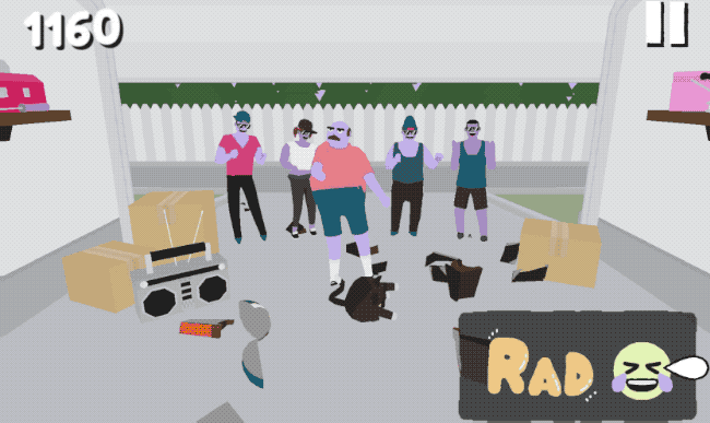 In Smash ‘n Dab you control a slightly overweight, balding dad as he struts his stuff to music playing on a boombox and dabs at objects that are being thrown his way. Dabbing at an object will smash it, earn you points and increase your multiplier. Hoverer if you miss an object or dab at any cats that are thrown at you then you’ll earn a strike and lose your multiplier. You can reset your strikes by hitting another object, but if you get three strikes in a row then it’s game over.
