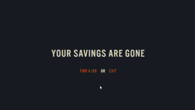 In Spent you take on the role of one of 14 million unemployed Americans who is struggling to make ends meet. You can choose to apply for one of three different jobs (warehouse worker, restaurant server and office temp), then try to deal with the various expenses life throws up at you – such as medical fees, rent, car expenses and things for your child. It is possible to make it through a month successfully but it’s very tough and you’ll have to take risks (such as not paying insurance) and sacrifice a lot.