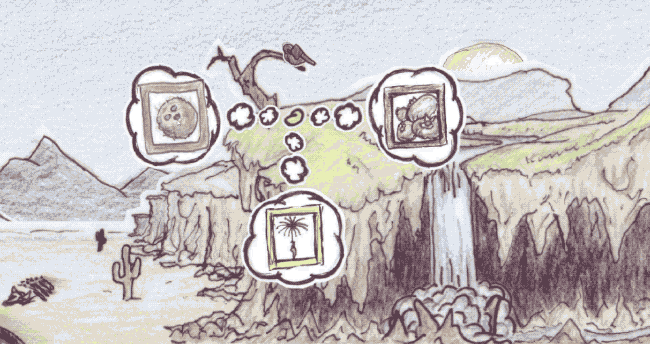 In Sprout you start as a little seed on a desert island filled with coconut trees. You’re surrounded by coconut trees but you feel like you’re not destined to be a one, you’re going to be a mighty oak, but first you need to learn how to be an oak. You can learn how to be any type of tree you like as long as you’ve already met one, but the oak forest is a long way away – how can you get there?