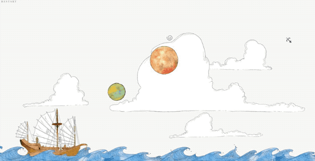 Drawing inspiration from The Little Prince and the Pixar short, La Luna, The Navigator sees you taking control of a young boy who is travelling through the high seas and must rearrange the planetoids in the sky to allow him to continue his journey. Each level starts with you in your little ship and you must use your grappling hook to climb up onto the little planetoids above you, then try to make your way to a little swirling symbol (usually) near the center of the screen. You can reposition the planets to aid your progress, by grabbing them with the grappling hook and pulling them towards you, but his only works if you are standing on a larger planet than the one you’re trying to move.