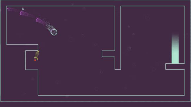 In Whiz the only control you have over your avatar’s movement is through the recoil your gun produces as you shoot. This means that if you want to move in one direction then you’ll have to shoot in the opposite direction, and you are affected by gravity so you’ll have to fire downwards to propel you into the air.